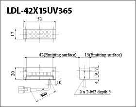 This Light Unit uses anti-spark LEDs with a peak wavelength of 365 nm and measures 52 x 17 x 20 mm (width x depth x height).