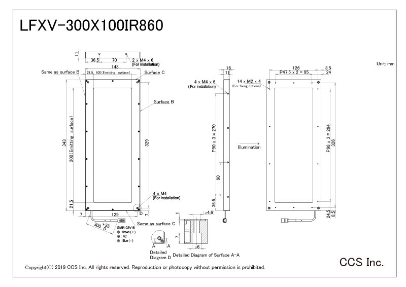 This Light Unit emits infrared light and measures 143 x 343 x 16 mm (width x depth x height).The light-emitting surface measures 100 x 300 mm.The new type of LFX Series.