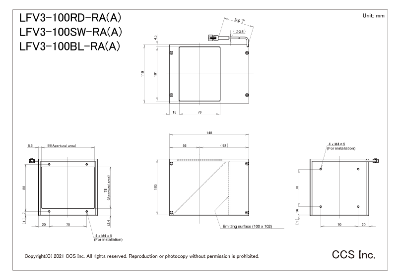 110mm (W) x 148mm (D) x 105mm (H) coaxial light with a light emitting surface of 100mm x 102mm. Available colors: red (LFV3-100RD-RA(A)), white (LFV3-100SW-RA(A)), and blue (LFV3-100BL-RA(A)). 90-degree position change of a standard coaxial light illumination port.