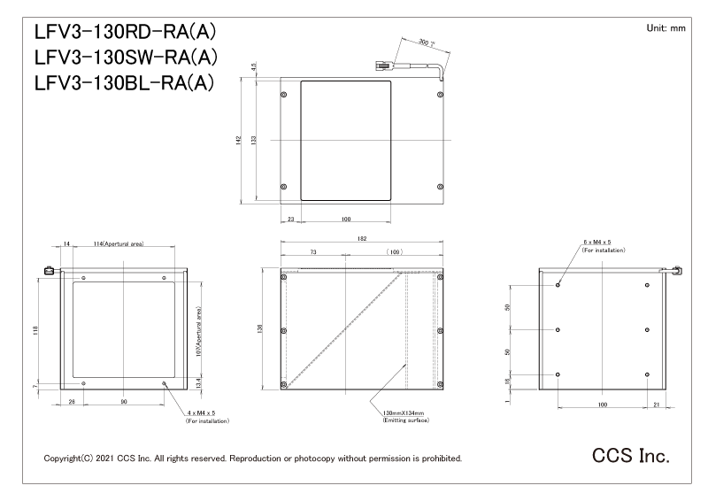 142mm (W) x 182mm (D) x 136mm (H) coaxial light with a light emitting surface of 130mm x 134mm. Available colors: red (LFV3-130RD-RA(A)), white (LFV3-130SW-RA(A)), and blue (LFV3-130BL-RA(A)). 90-degree position change of a standard coaxial light illumination port.