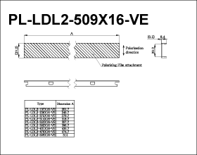 For the LDL2-509X16(-WD)-series Bar Lights.This is a bar-type Polarizing Plate.Use the polarizing plate together with a plarizing filter to eliminate the surface reflection of the workpiece.The end of the model name is -VE: Light is polarized parallel to the shorter edge of the plate.The end of the model name is NOT -VE: Light is polarized parallel to the longer edge of the plate.
