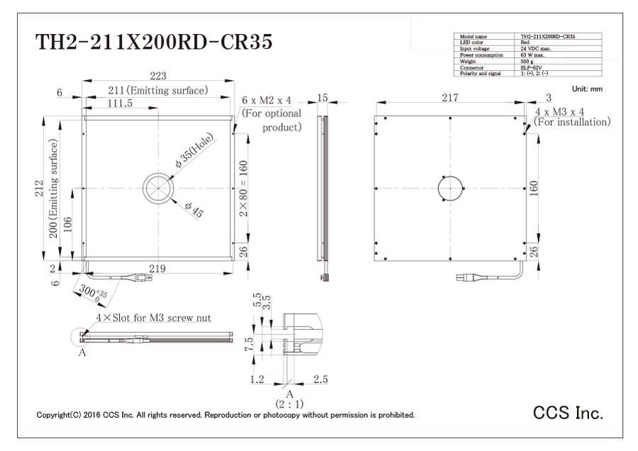 This Light Unit emits red light and measures 223 x 212 x 15 mm (width x depth x height).The light-emitting surface measures 211 x 200 mm.Camera-window type.
