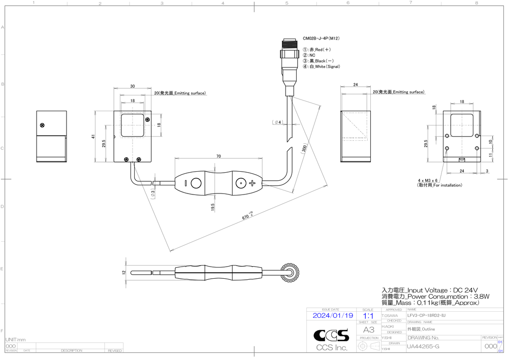 This Light Unit with lntensity Control Unit emits red light and measures 30 x 41 x 24 mm (width x depth x height)